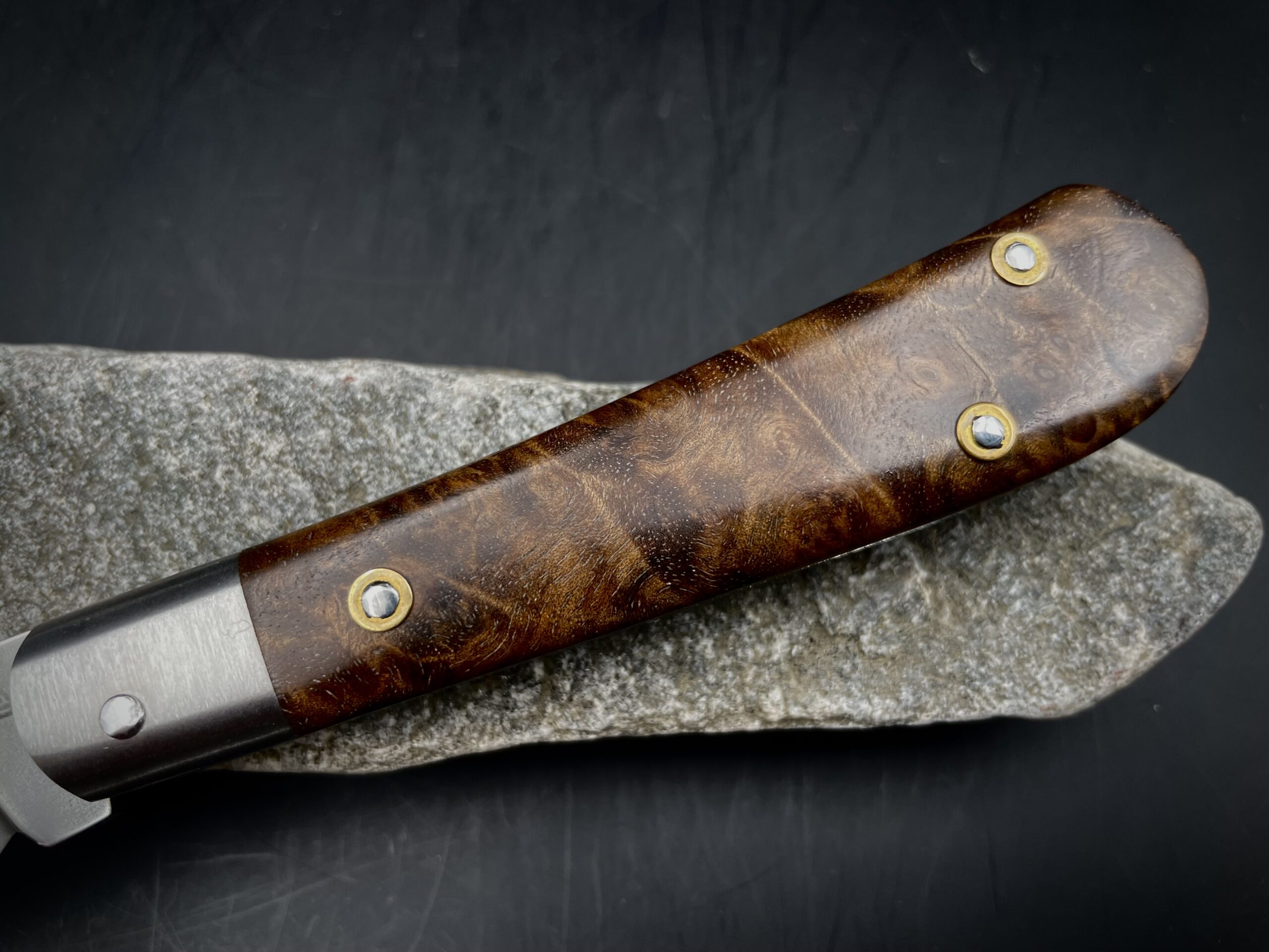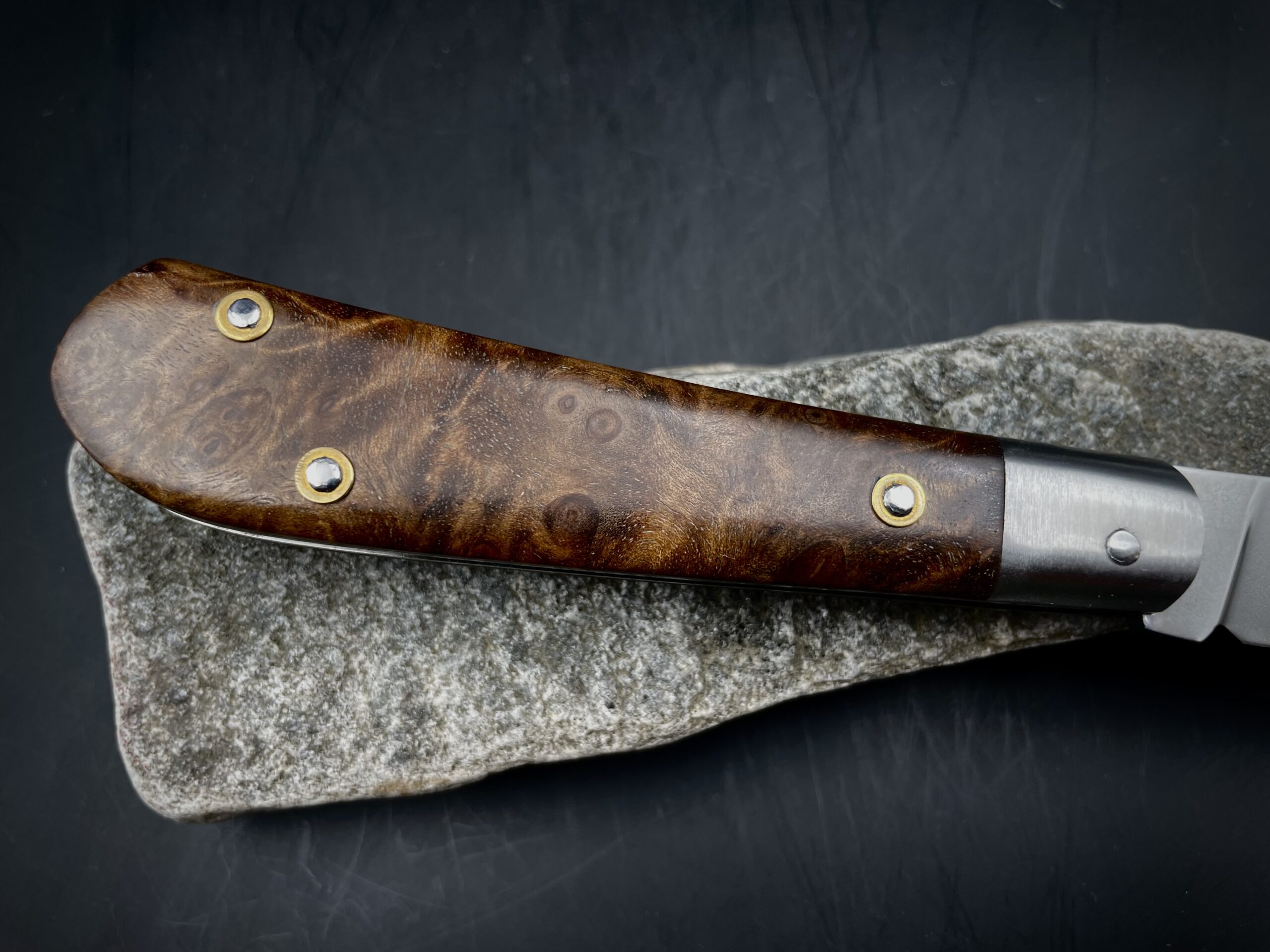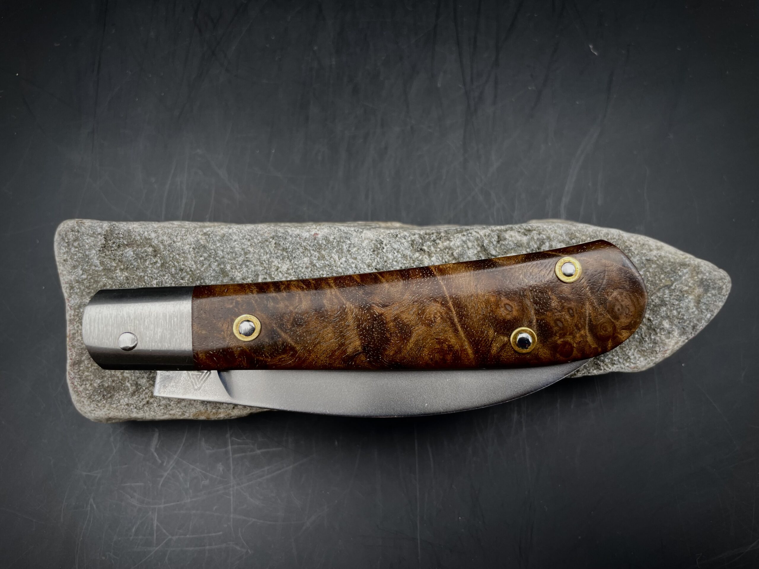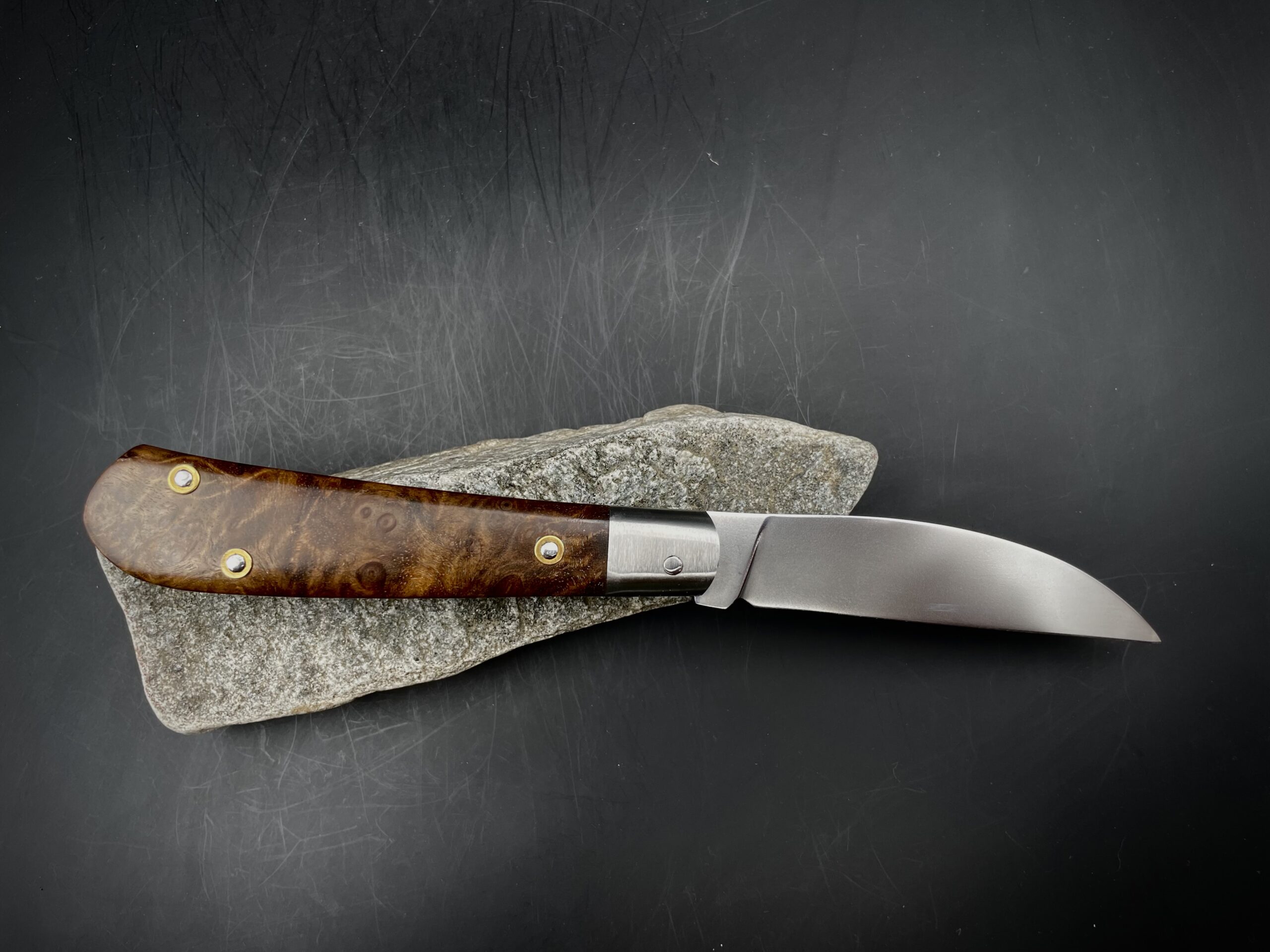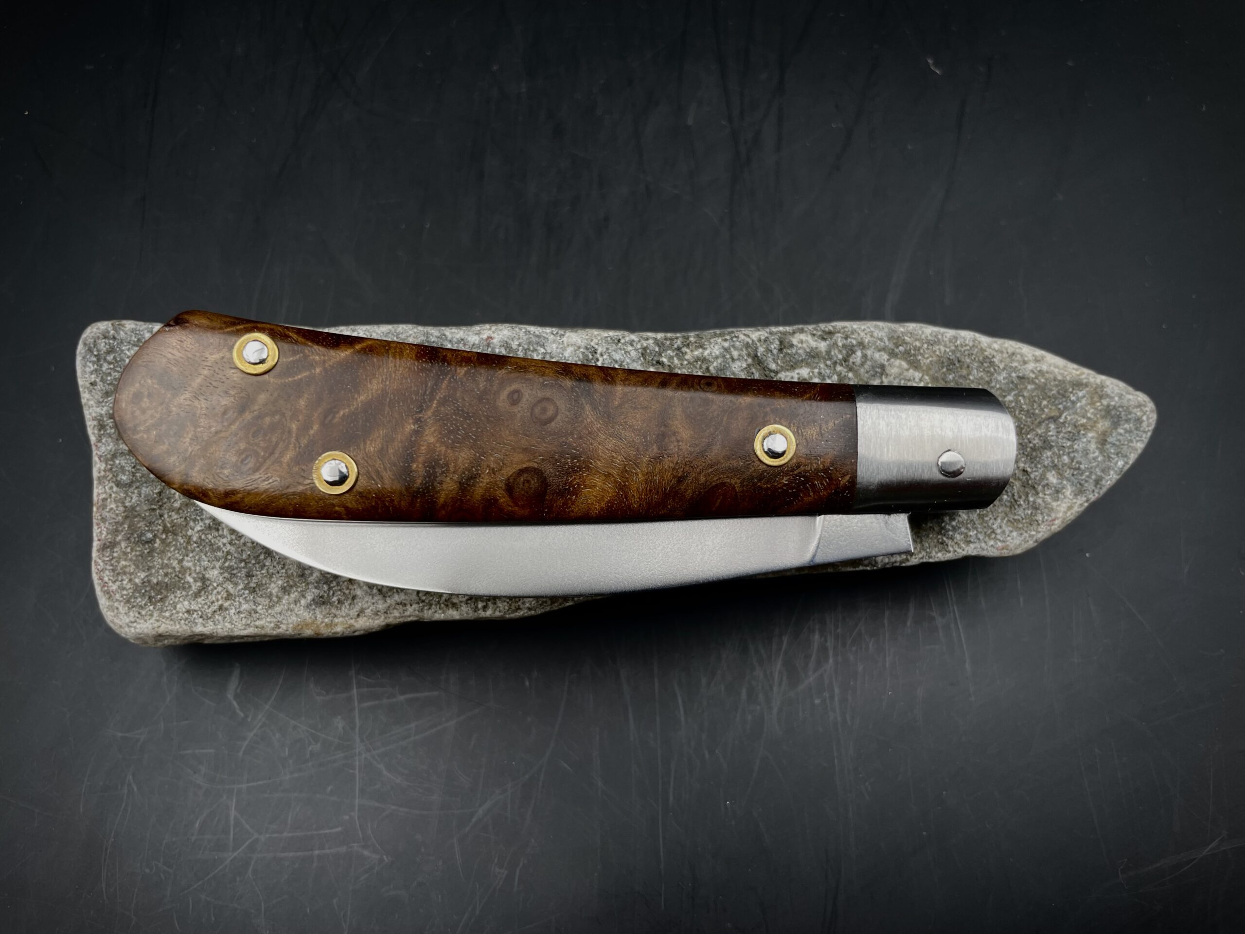 Montage d’un couteau à cran carré (le « persian » visible dans les pages couteaux). Choix des matériaux pour votre manche (hors matériaux « précieux »). Pour pouvoir fabriquer le couteau sur une journée, je prépare le ressort à l’avance : — lors du stage : travail sur la lame (découpe, ajustage, traitements thermiques) et réalisation du manche. Durée : 1 journée de stage. 300 euros (repas compris).