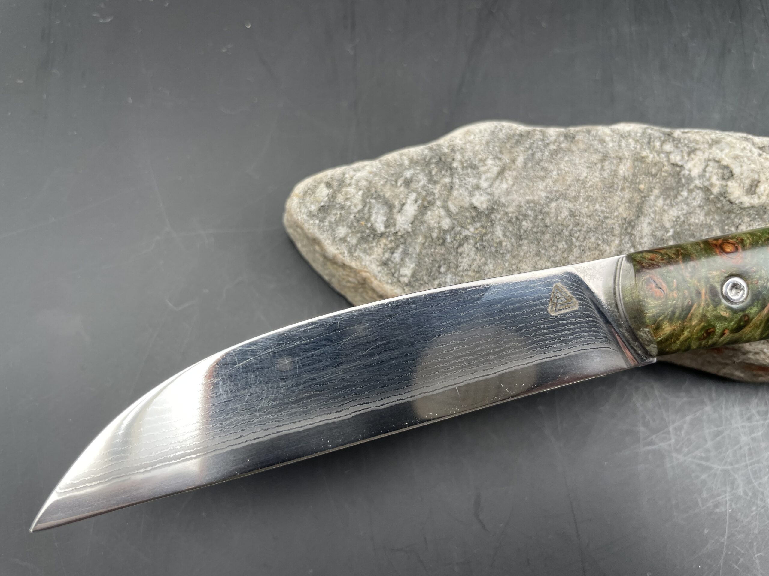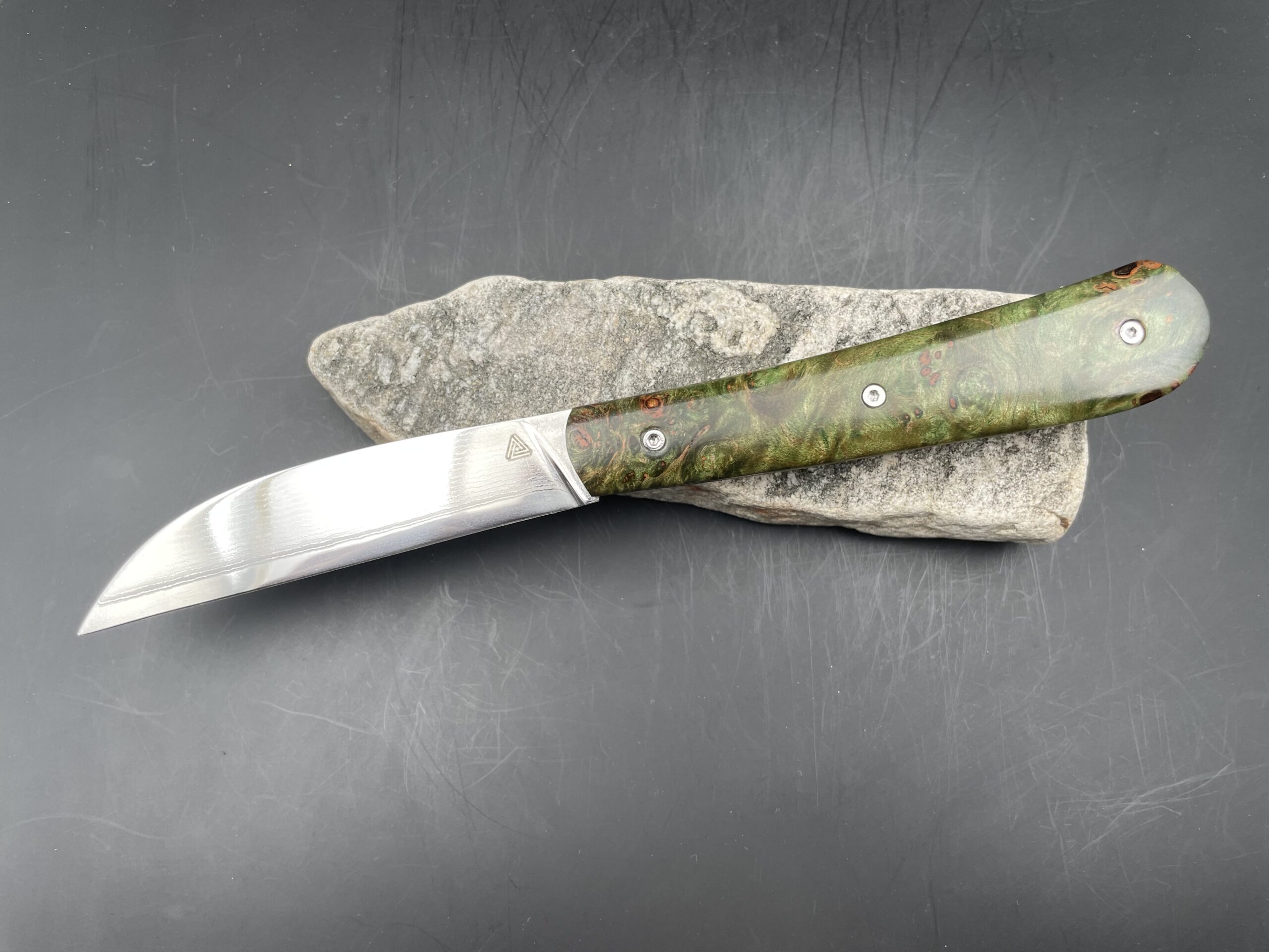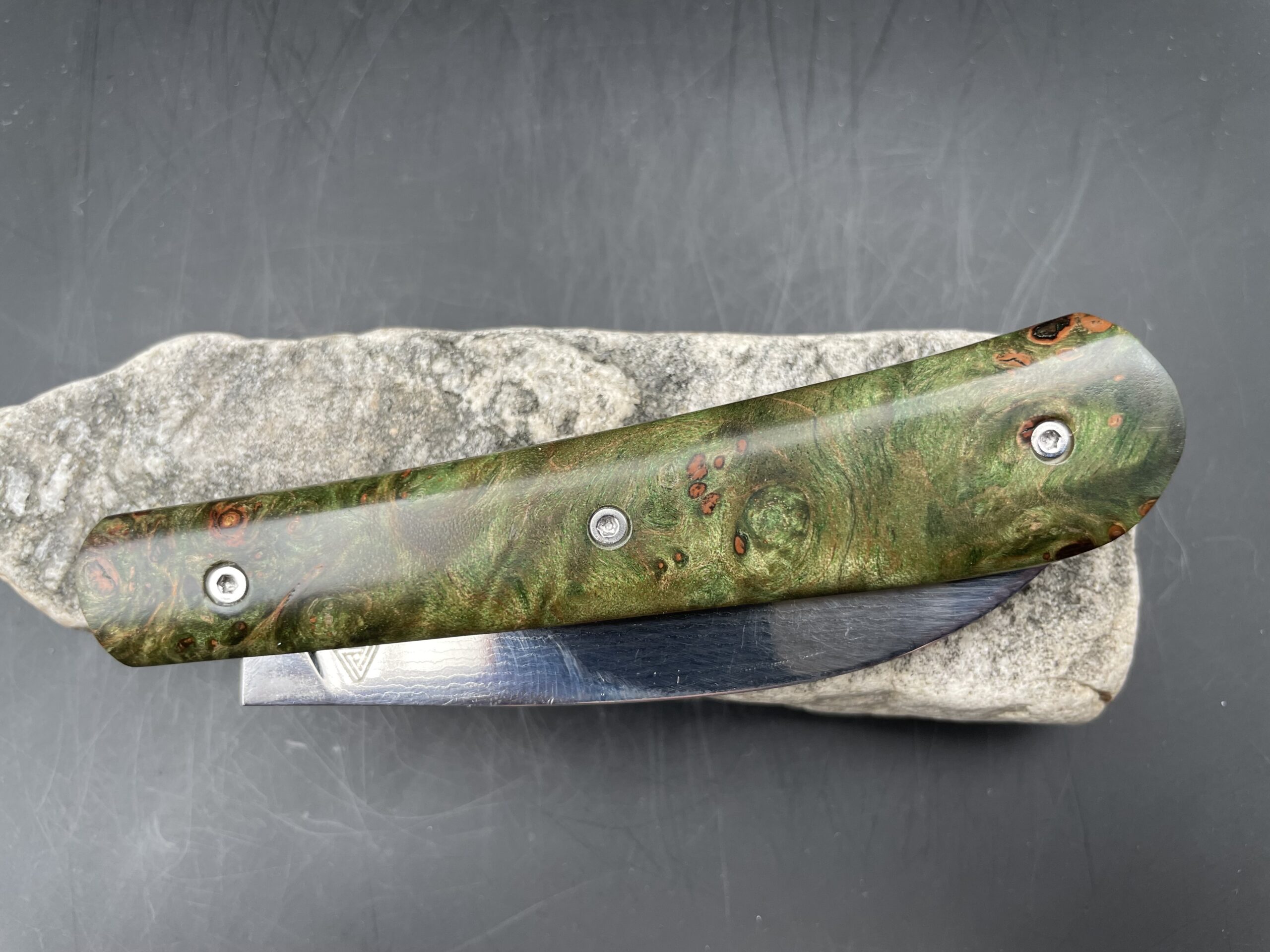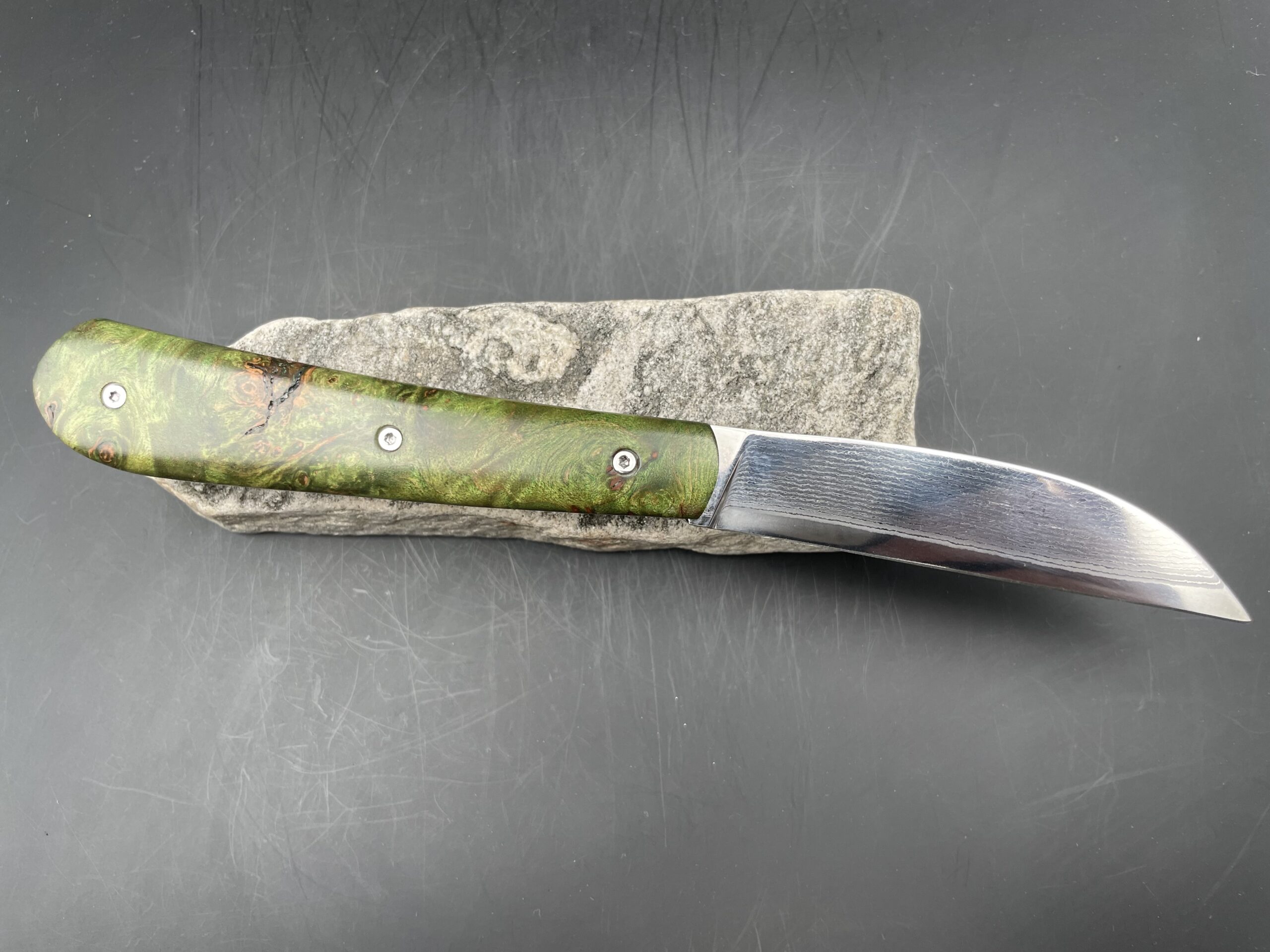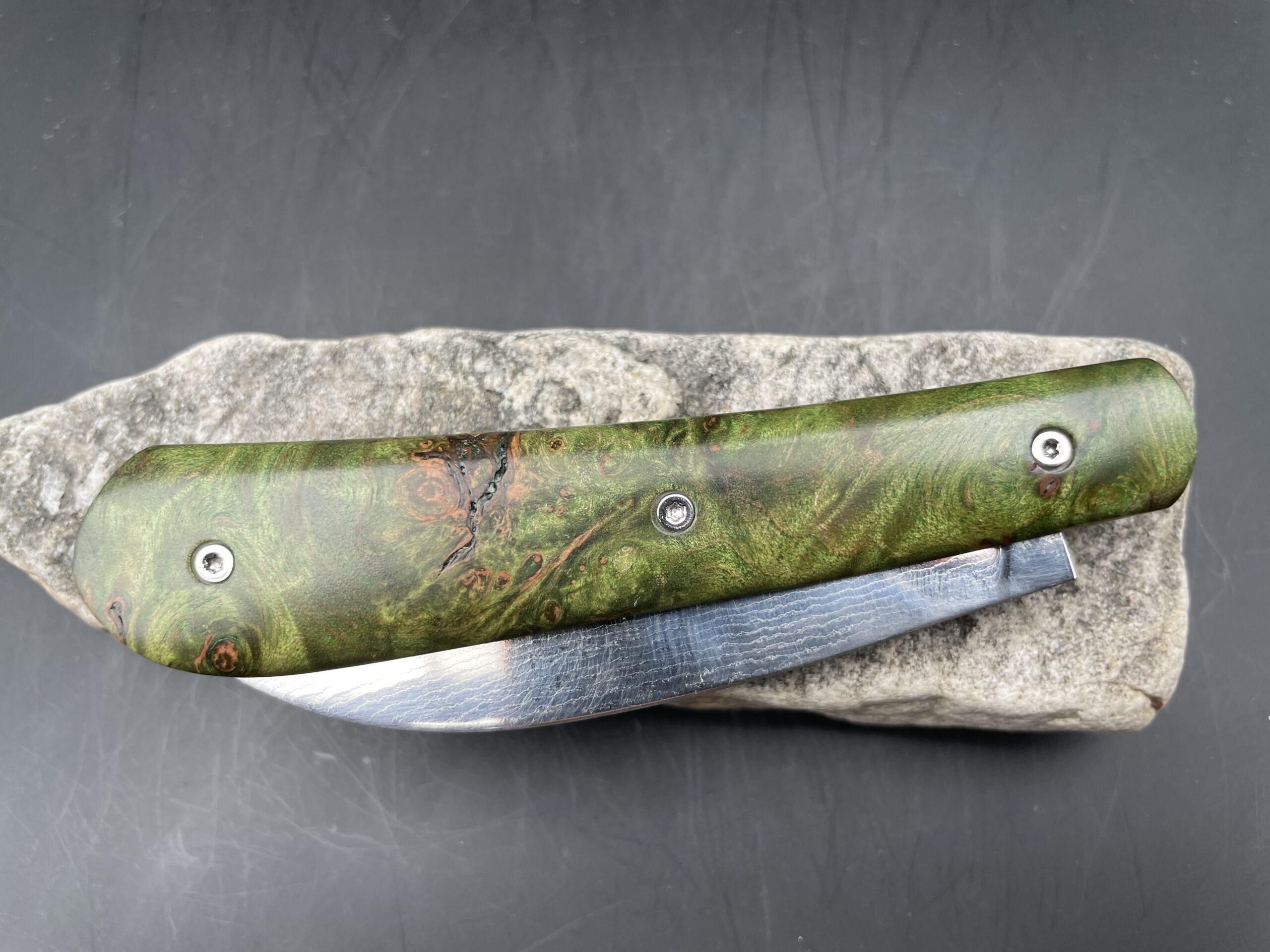 « Swayback » lame suminagashi inox et loupe d’érable teintée vert